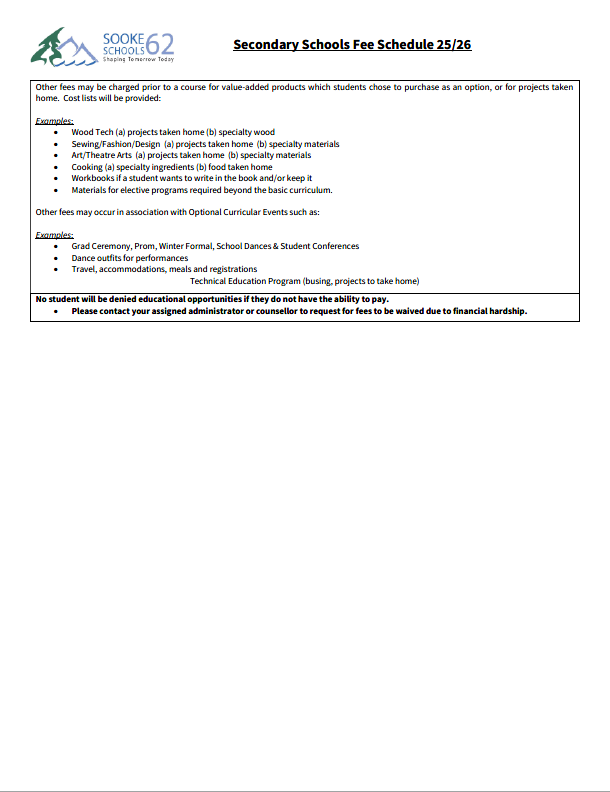 No student will be denied educational opportunities if they do not have the ability to pay. Please contact your assigned administrator or counsellor to request for fees to be waived due to financial hardship.